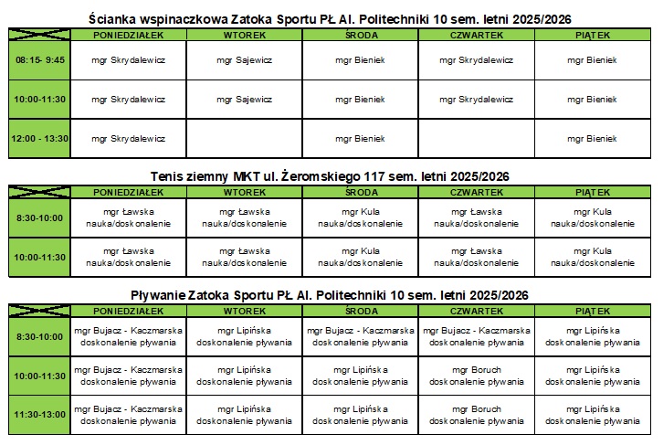 11:30-13:00 doskonalenie pływania - mgr Joanna Lipińska