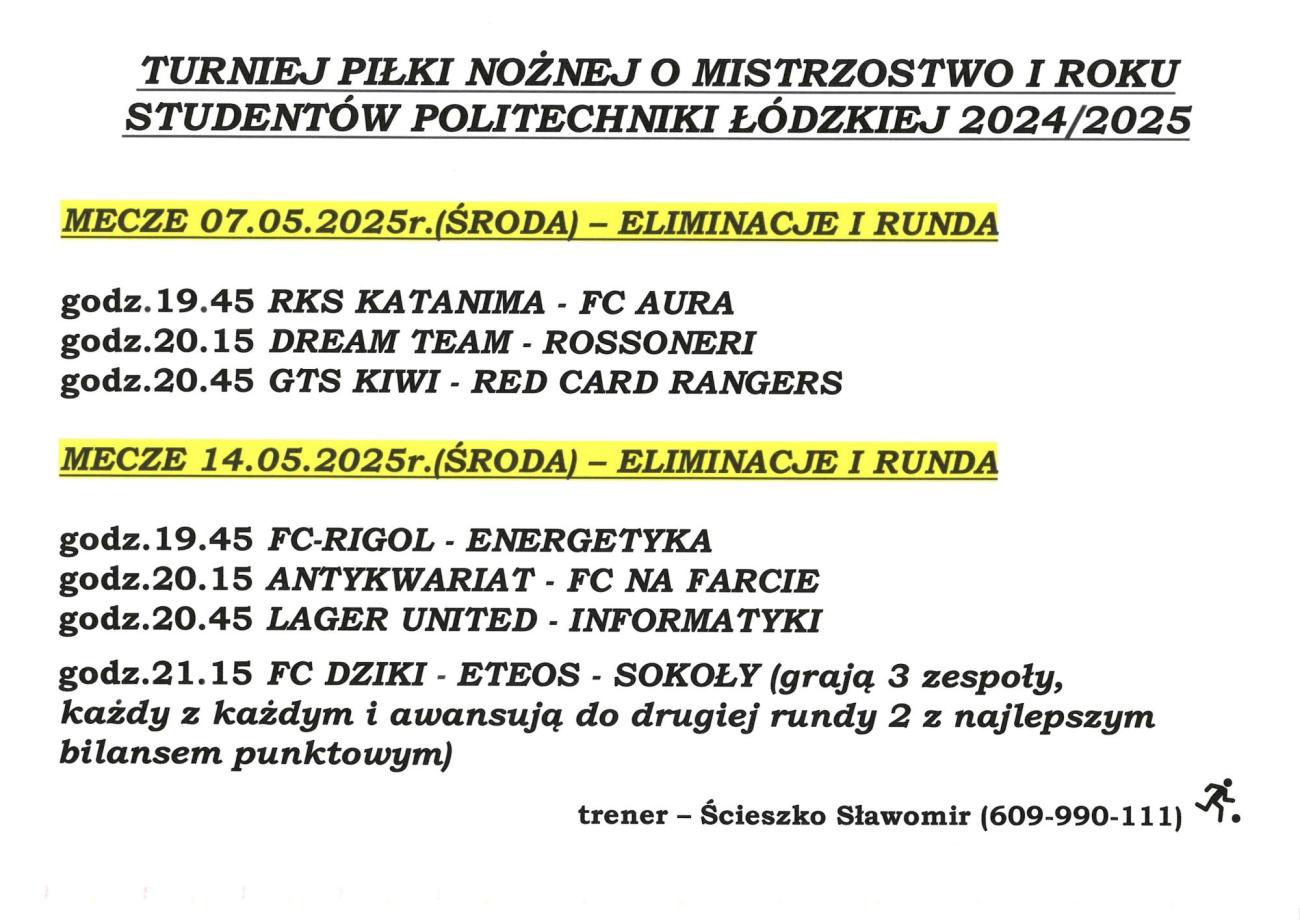 access_time Data dodania 05.05.2025 - 09:12 bookmark_border Kategorie Aktualności TERMINARZ I RUNDY - TURNIEJ PIŁKI NOŻNEJ o MISTRZOSTWO I ROKU STUDENTÓW PŁ 2024-2025 Image